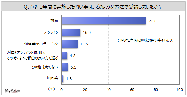【習い事に関する調査】直近1年間に習い事をした人は1割強。今後習い事をしたい人のうち、「対面」で受講したい人は4割強、「オンライン」が約7%、「対面とオンラインを併用」が約16%