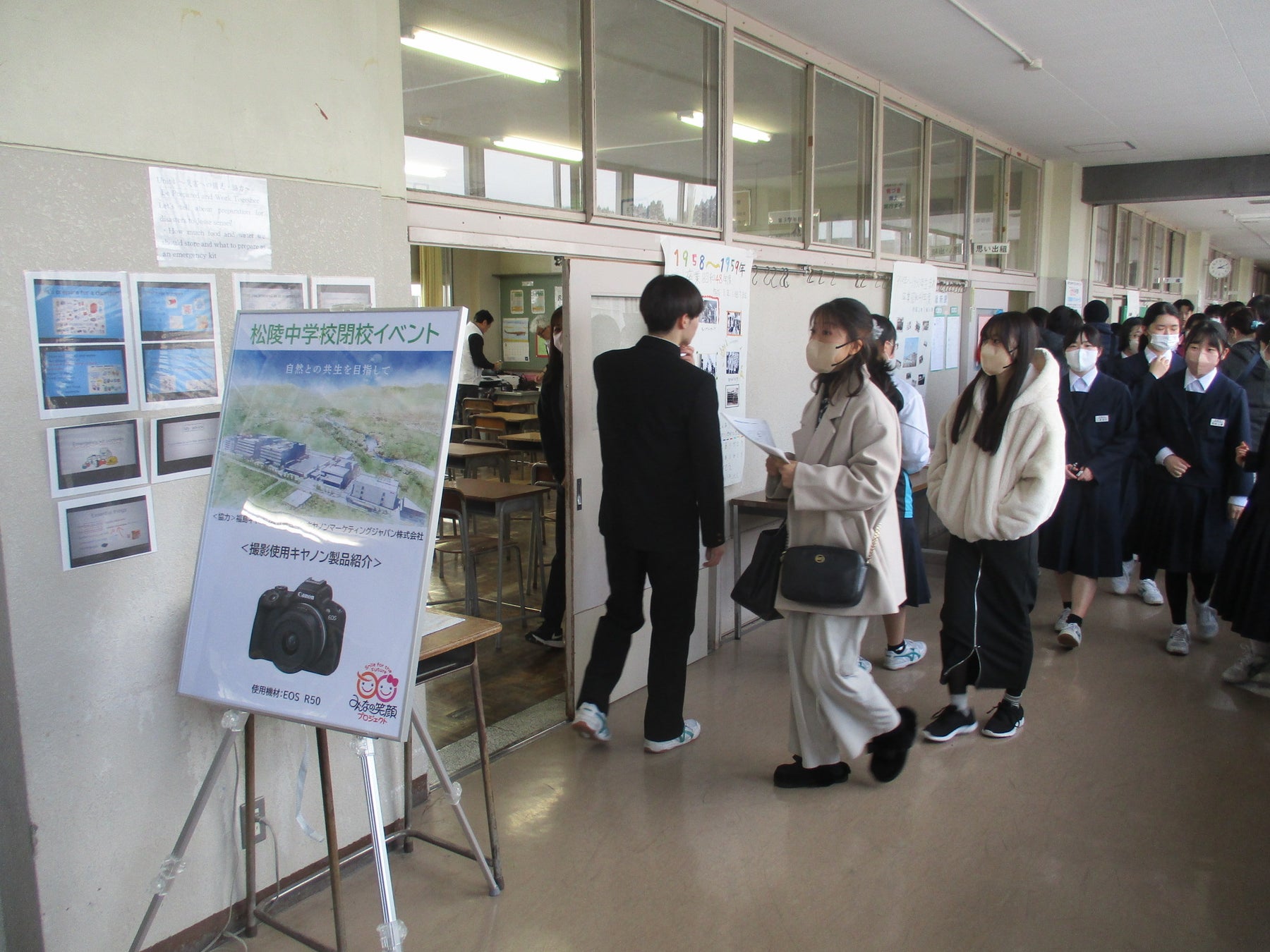 また、キヤノンMJはオリジナル年表制作時の写真を貼ったコルクボードを記念品として学校に贈呈し、閉校イベント当日に入口に飾られました。