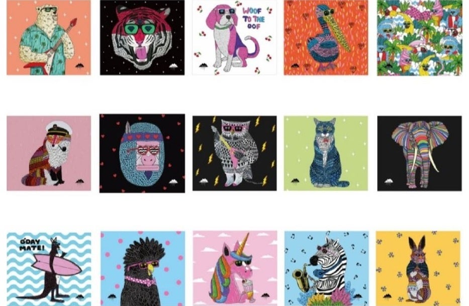 描くアートはほとんどが動物で、それぞれに名前や性別が設定されています。サングラスをかけていたり、サーフボードや楽器を持っていたり、それぞれのキャラクターにストーリーがあり、愛着のわく魅力的な作品ばかりです。