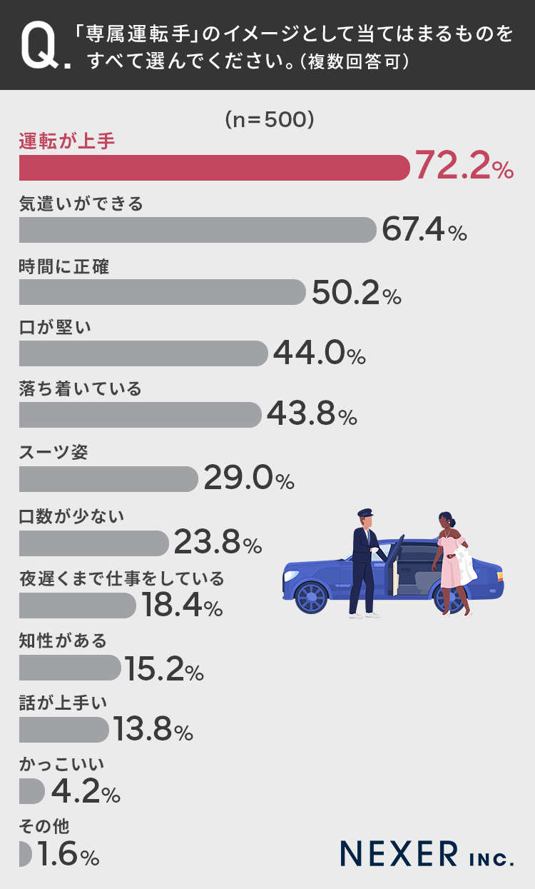 ■「専属運転手」のイメージ、72.2%が「運転が上手」67.4%が「気遣いができる」