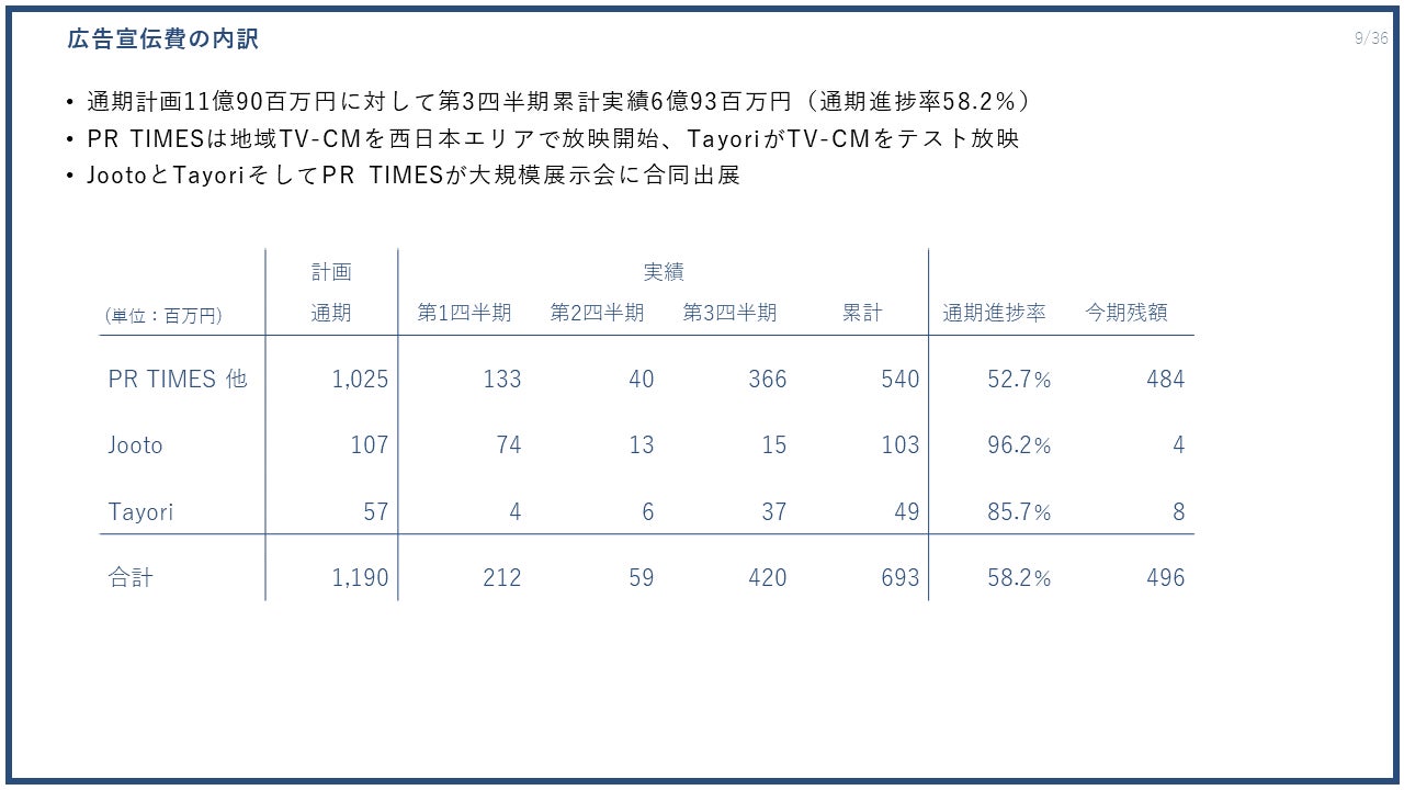 今期は広告宣伝費に11億9000万円を投じる見通しだと示していますが、第3四半期累計実績は6億9300万円となりました。通期計画に対する進捗率は58.2%となっております。PR TIMESは地域TV-CMを西日本エリアで放映し、TayoriもTV-CMをテスト放映しています。また、JootoとTayori、PR TIMESが合同で大規模展示会へ出展しました。四半期で大きな変動がありますが、通期ではおおむね計画通りに進捗しています。