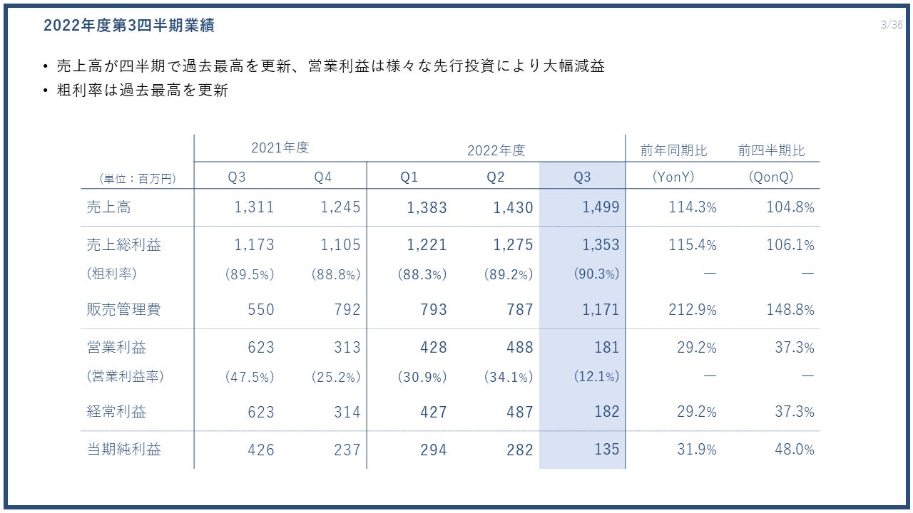売上高は四半期で過去最高を更新したものの、営業利益は様々な先行投資により大幅に減益しています。また粗利率は4四半期ぶりに過去最高を更新して、はじめて90%を超えています。