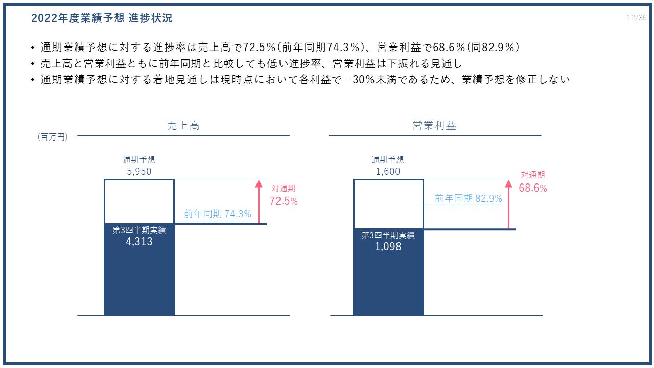 2022年度の通期業績予想に対する進捗率は、第3四半期が経過して、売上高で59億5000万円に対し72.5%(前年同期74.3%)、営業利益で16億円に対し68.6%(前年同期82.9%)と進捗しております。売上高、営業利益ともに前年同期と比較しても低い進捗であり、営業利益は下振れて着地する見通しです。通期業績予想に対する着地見通しは現時点において各利益で-30%未満であるため、業績予想を修正いたしません。