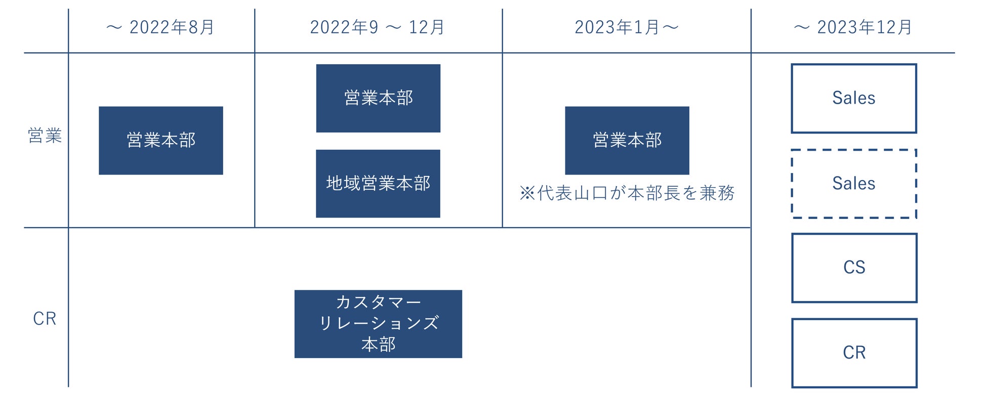 2022年9月の組織変更で地域営業に特化する部署を切り出しましたが、営業本部とともに機能に課題があり、2023年1月に再統合し、代表山口が本部長を兼務する形で、プレスリリース件数を伸長できる組織再建に取り組んでいます。今後、2023年12月までに兼務を解消し、営業とカスタマーリレーションズを併せた顧客接点を持つ部門を3部署以上で組成、責任者を配置することを計画しています。