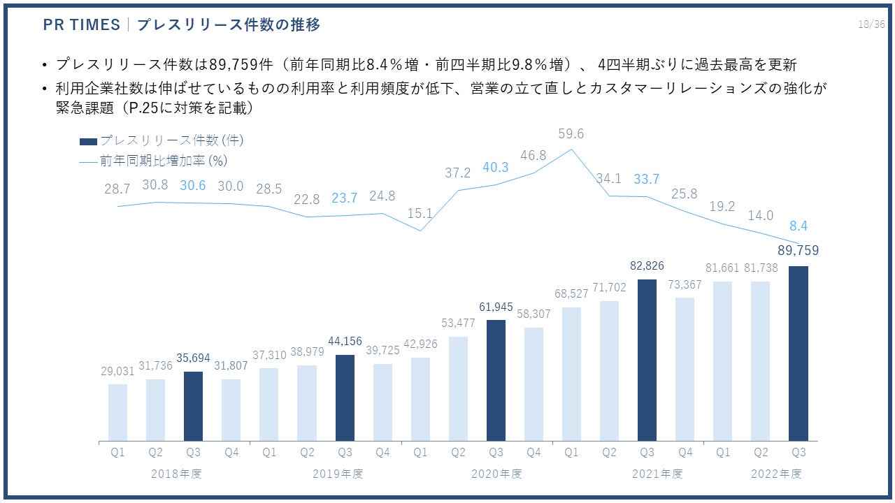 2022年度第3四半期は、8万9759件(前年同期比8.4%増、前四半期比9.8%増)のプレスリリースを配信いただき、4四半期ぶりに過去最高を更新しました。利用企業社数の増加に対して、プレスリリース件数が伸び悩んでいるのは、利用率と利用頻度の低下が原因です。営業の立て直しとカスタマーリレーションズの強化を緊急課題として取り組みはじめています。(具体的な対策については後述いたします)