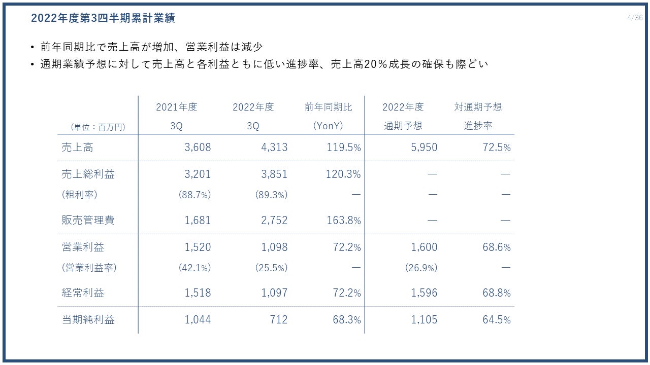 2022年4月13日に公表した通期業績予想に対する進捗率は、売上高で72.5%、営業利益で68.6%、当期純利益で64.5%となっております。また創業来14期連続で売上高25%成長を続けておりますが、2022年度は第3四半期まで経過して、20%成長の確保も際どい状況となっております。