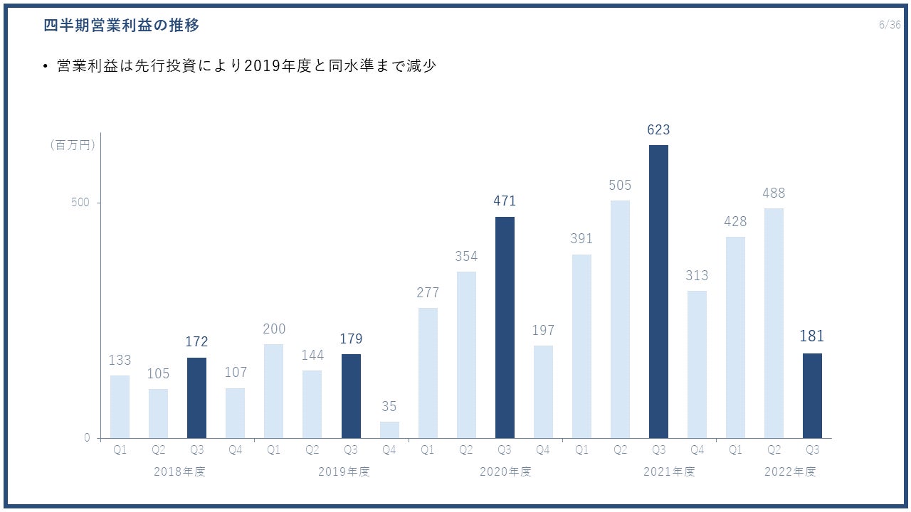 四半期営業利益の推移においては、様々な先行投資を行ったことにより、2019年度と同水準まで減少しています。