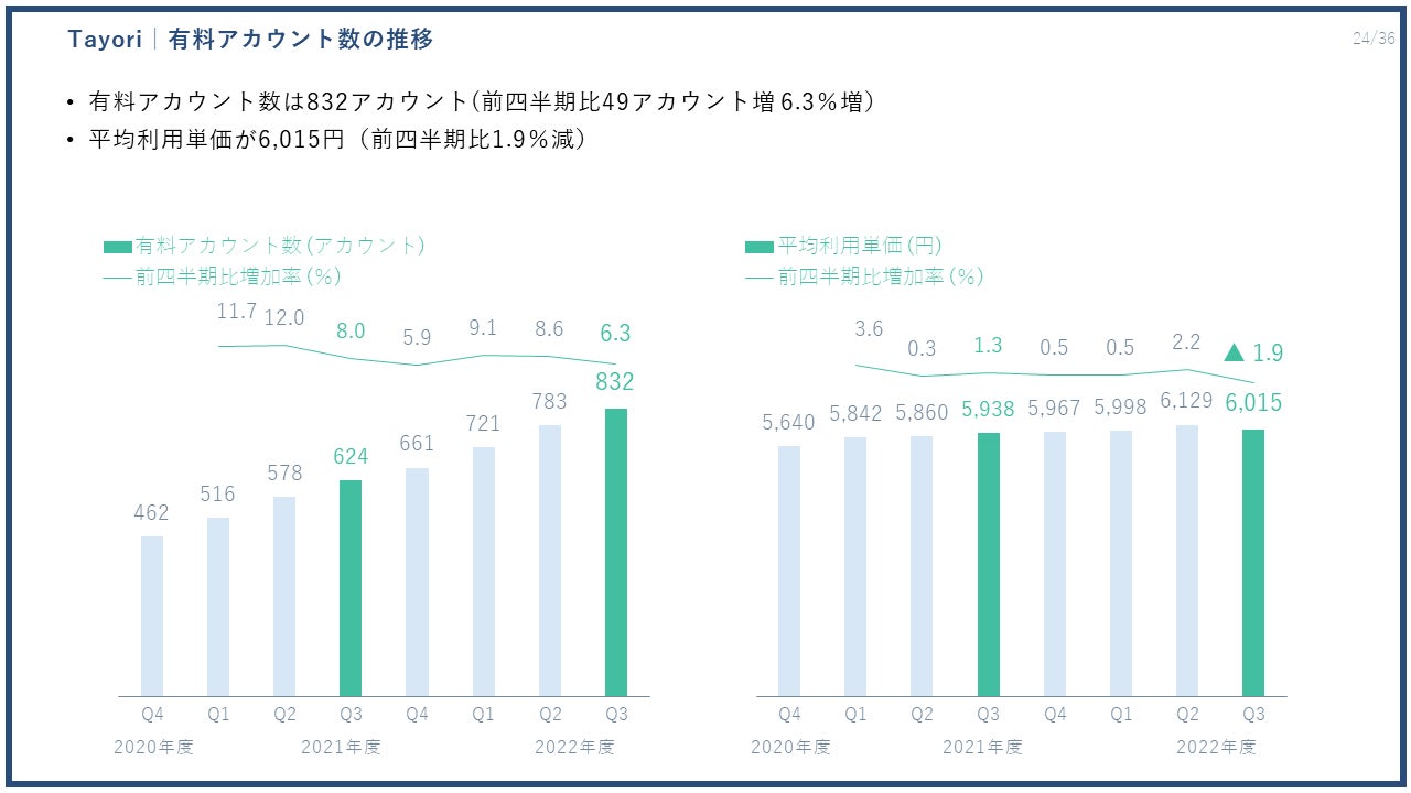 11月末時点の有料アカウント数は832と、前四半期比で49アカウント(6.3%)増となり、順調に有料化が進んでいます。平均利用単価は6015円(前四半期比1.9%減)となりました。平均利用単価の低下は一時的なものであり、今後も引き続きアカウント数と利用単価を合わせて伸ばしていく方針です。