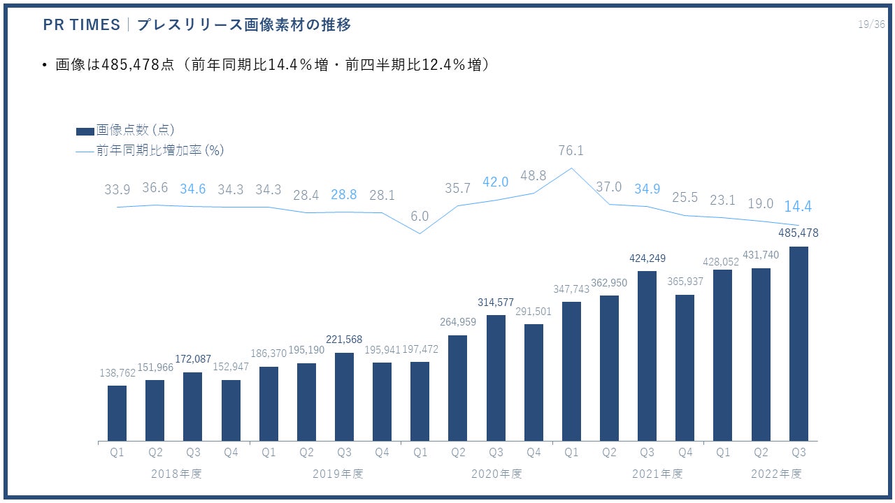 「PR TIMES」のプレスリリースに掲載いただく画像や動画の数については、画像が48万5478点(前年同期比14.4%増・前四半期比12.4%増)と3四半期連続で過去最高を更新、動画が8276本(前年同期比23.8%増・前四半期比11.9%増)と2四半期ぶりに過去最高を更新しています。引き続き、プレスリリースのリッチコンテンツ化が進んでいます。