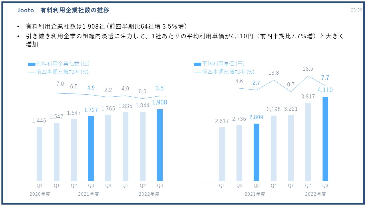 11月末時点の有料利用企業社数は1908社で、前四半期比で64社(3.5%)増となりました。引き続き、利用企業の組織内浸透に注力しており、1社あたりの平均利用単価が4110円(前四半期比7.7%増)と2四半期連続で大きく増加しました。引き続き、利用社数と利用単価の両方を追っていく方針です。
