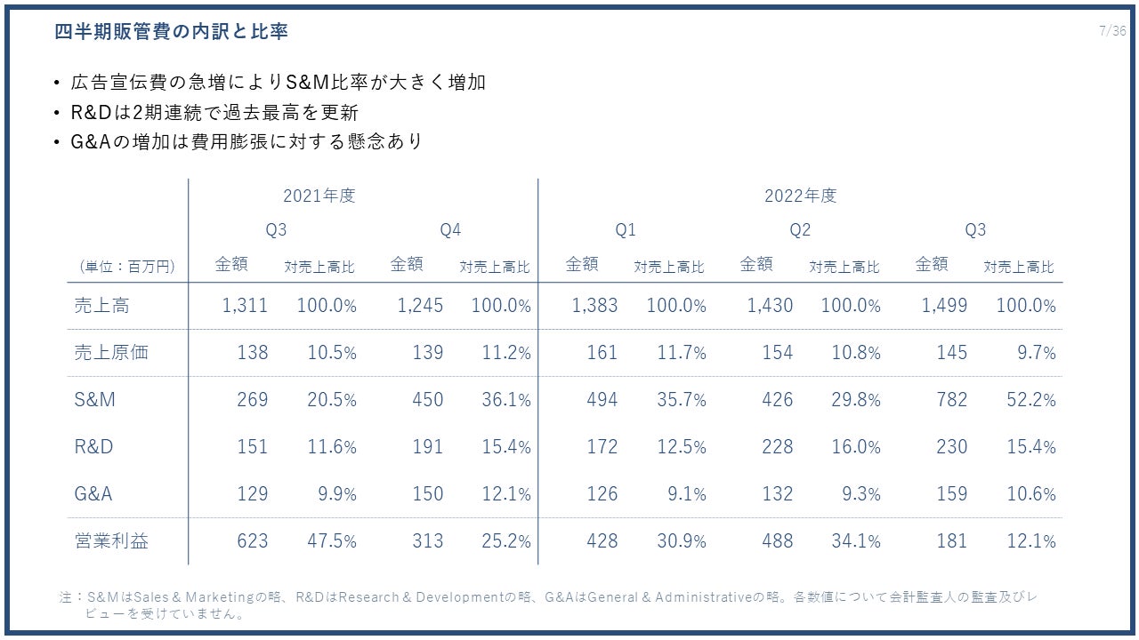 売上高比率はS&Mが52.2%、R&Dが15.4%、G&Aが10.6%となりました。第3四半期は計画通りの広告宣伝費の急増によりS&M比率が大きく増加しており、R&Dも2期連続で過去最高を更新しており、計画通りの投資ができています。また、G&Aの増加に対しては採用教育費などの費用膨張に対する懸念を持っています。