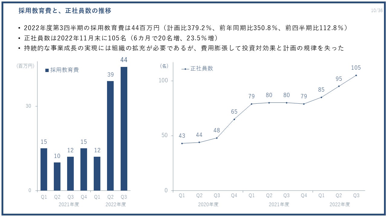 販売管理費の中で、採用教育費も共有させていただきます。2022年度第3四半期では採用教育費に4400万円(計画比379.2%、前年同期比350.8%、前四半期比112.8%)を投じました。持続的な事業成長の実現に向けて、組織も事業に合わせて拡充させる必要がありますが、投資対効果と計画に対して規律を失い、費用を膨張させてしまったと振り返っています。