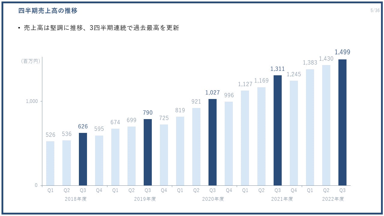 四半期売上高の推移においては、堅調に成長基調を継続しており、第3四半期は3四半期連続で過去最高の四半期売上高を更新しております。
