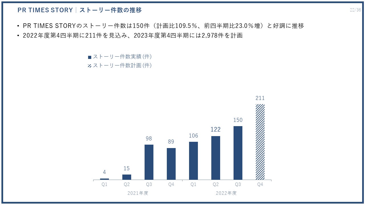 「PR TIMES STORY」は、この第3四半期の利用は150件と計画比109.5%、前四半期比23%増と好調に推移しています。第4四半期には211件を見込み、来期の第4四半期には2,978件を計画しています。