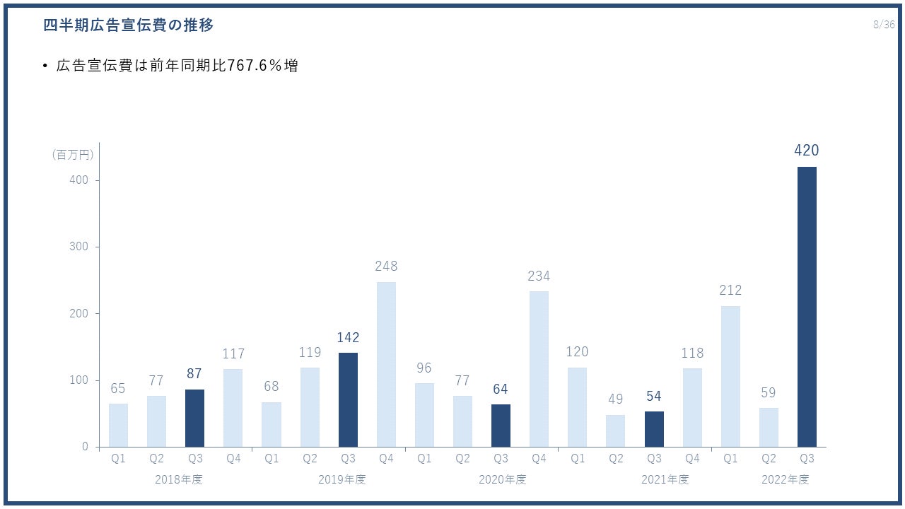 S&Mの中で広告宣伝費について、第3四半期はテレビCMや展示会の出展など大きく投資し、4億2000万円と前年同期比で767.6%となっています。