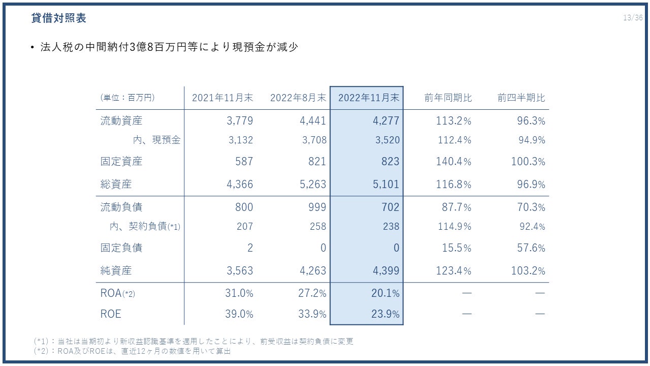 業績概況の最後に、バランスシートをご紹介させていただきます。法人税の中間納付(3億800万円)等により、現預金が減少しています。ROAとROEともに20%を超える高水準をキープしています。短期的な足元の水準ではなく、5年、10年という中長期でこの水準を維持するには、一時的な超過利潤に満足せず、しっかりと利益を投資して、事業の競争優位を強固にし、超過利潤を上げ続けることが大切だと考えています。