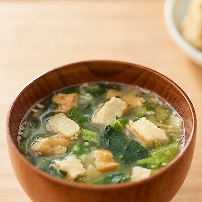 厚揚げと小松菜を合わせた具だくさんの味噌汁です。