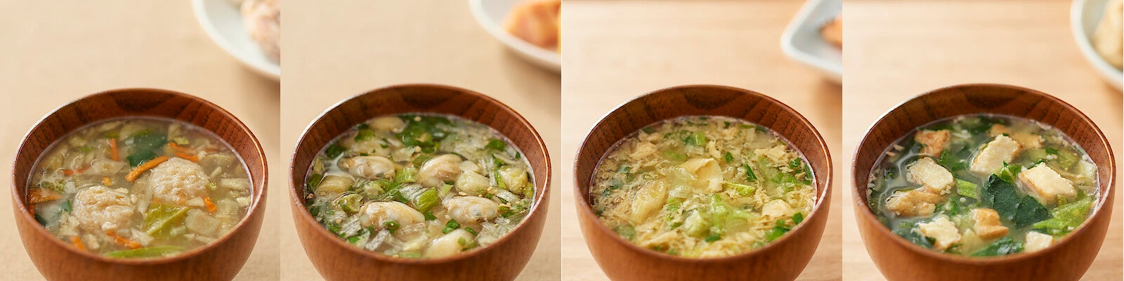 メイン具材の種類が偏らないよう、新たに鶏つくね、あさり、卵、厚揚げの4種類をメイン具材に使いました。充実したラインナップで、合わせる食事やその日の気分に合わせて味噌汁を選んでいただけます。