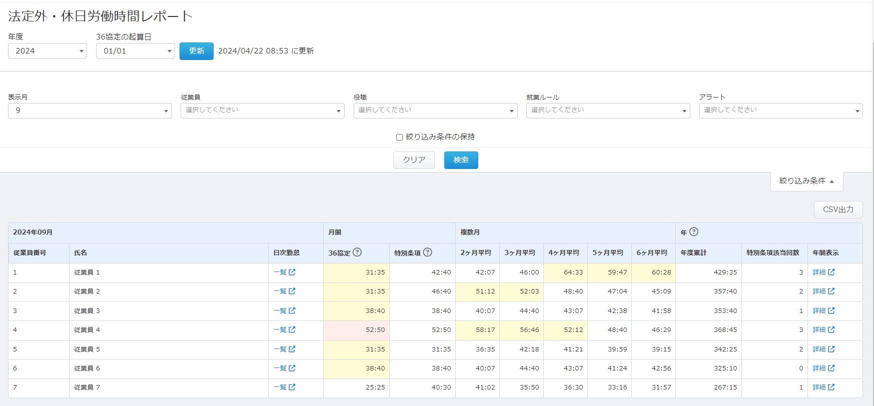 「法定外・休日労働時間レポート」画面から、各月の従業員の法定外時間等を一覧で確認することが可能です。