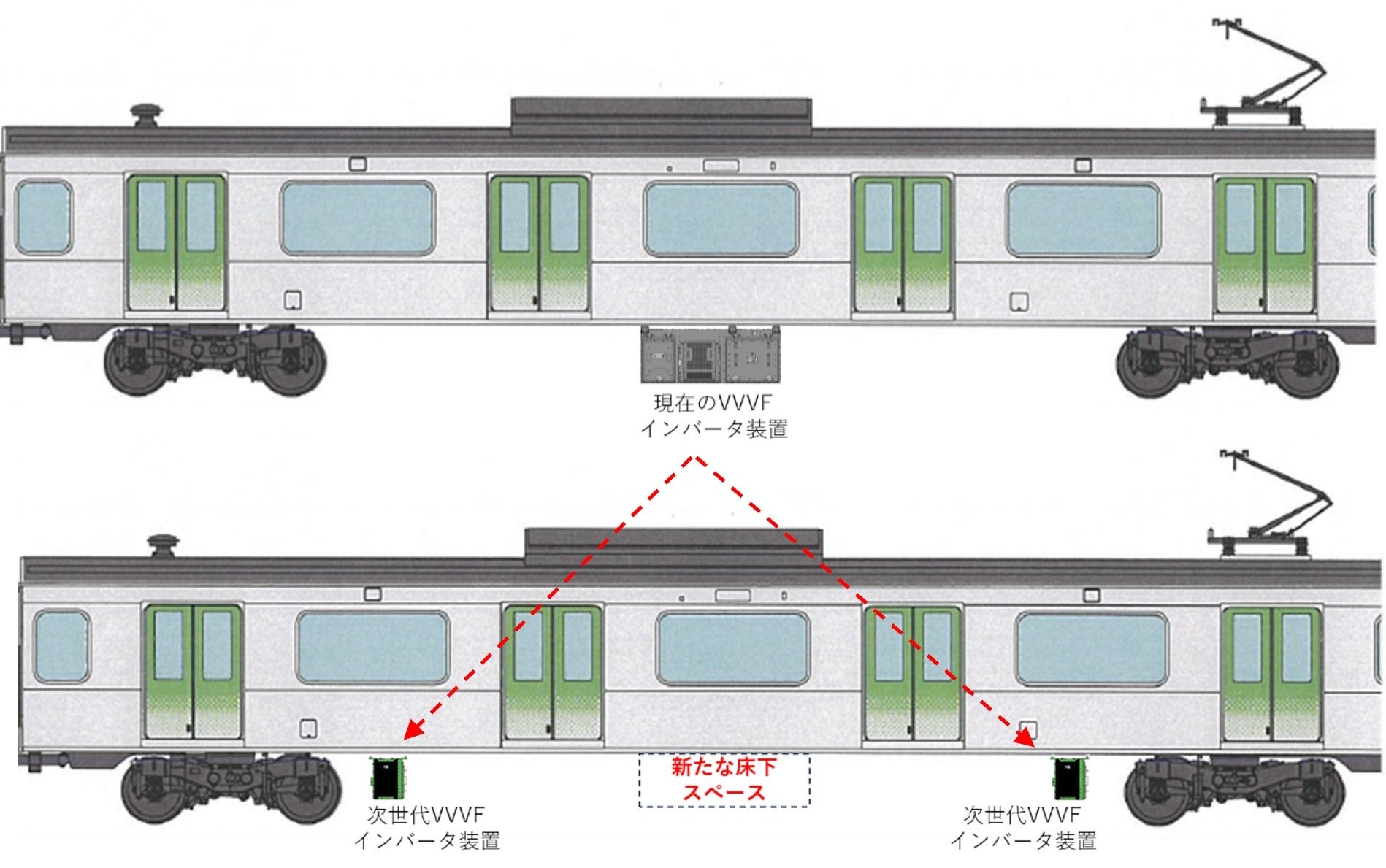 現在のVVVFインバータ装置は大型の機器のため、車両の床下中央部に艤装され、床下に大きな艤装スペースを必要としています。