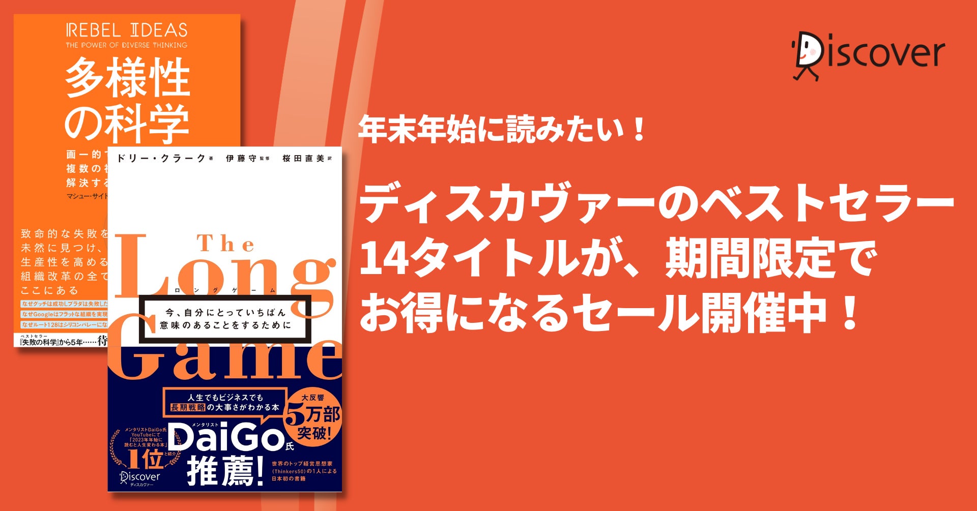 メンタリストDaiGoさんにおすすめされたベストセラー『ロングゲーム』や、19万部を突破しているベストセラーシリーズ『失敗の科学』『多様性の科学』などの14タイトルが対象です。