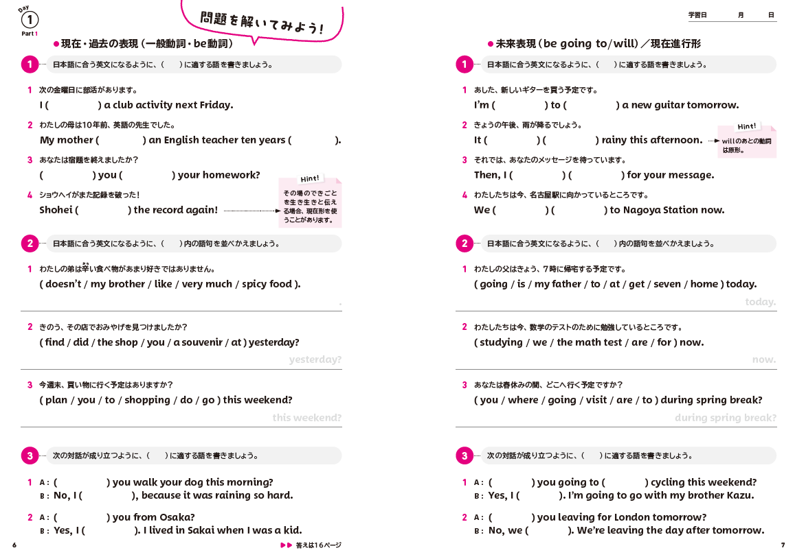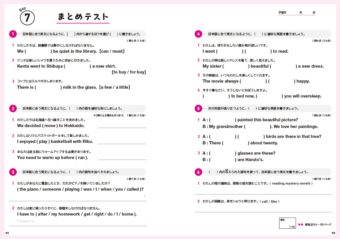 1日目~5日目は Part 1 と Part 2 の2部構成。それぞれ「解説2ページ+問題演習4ページ」でしっかり演習に取り組める構成です。7日目には「まとめテスト」も。