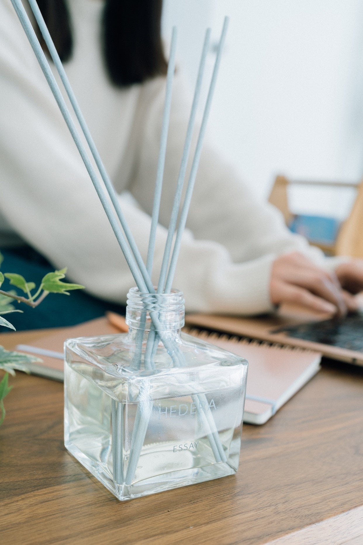 リードディフューザーとファブリックミストの2種類のルームフレグランス『ESSAY』には、イングリッシュアイヴィーのすっきりした爽やかさをアクセントにもつ、『HEDERA』オリジナルの「ホワイトティー」を使用しています。