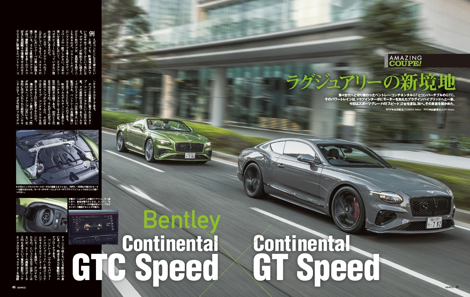 第4世代へと切り替わった「 ベントレー・コンチネンタルGT 」とコンバーチブルの「 GTC 」。そのパワートレインは、4ℓV8ツインターボにモーターを加えたプラグインハイブリッド。今回はスポーツグレードの「スピード」2台を連ねて街へ。その真価を確かめた。