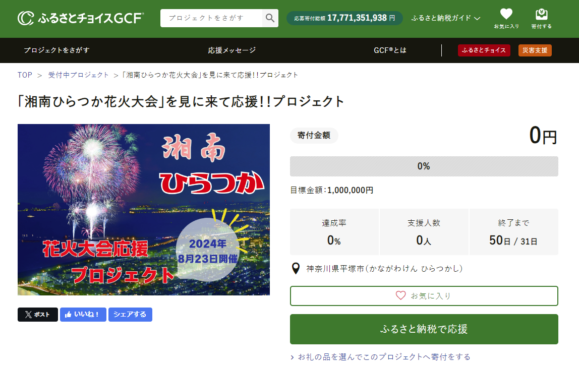 平塚市としては、長年地域に根付いてきた湘南ひらつか花火大会を今後も来場者に魅力のある地域の誇りとして継続させていくとともに、地域の活性化を図るため、GCF®で支援を募ります。