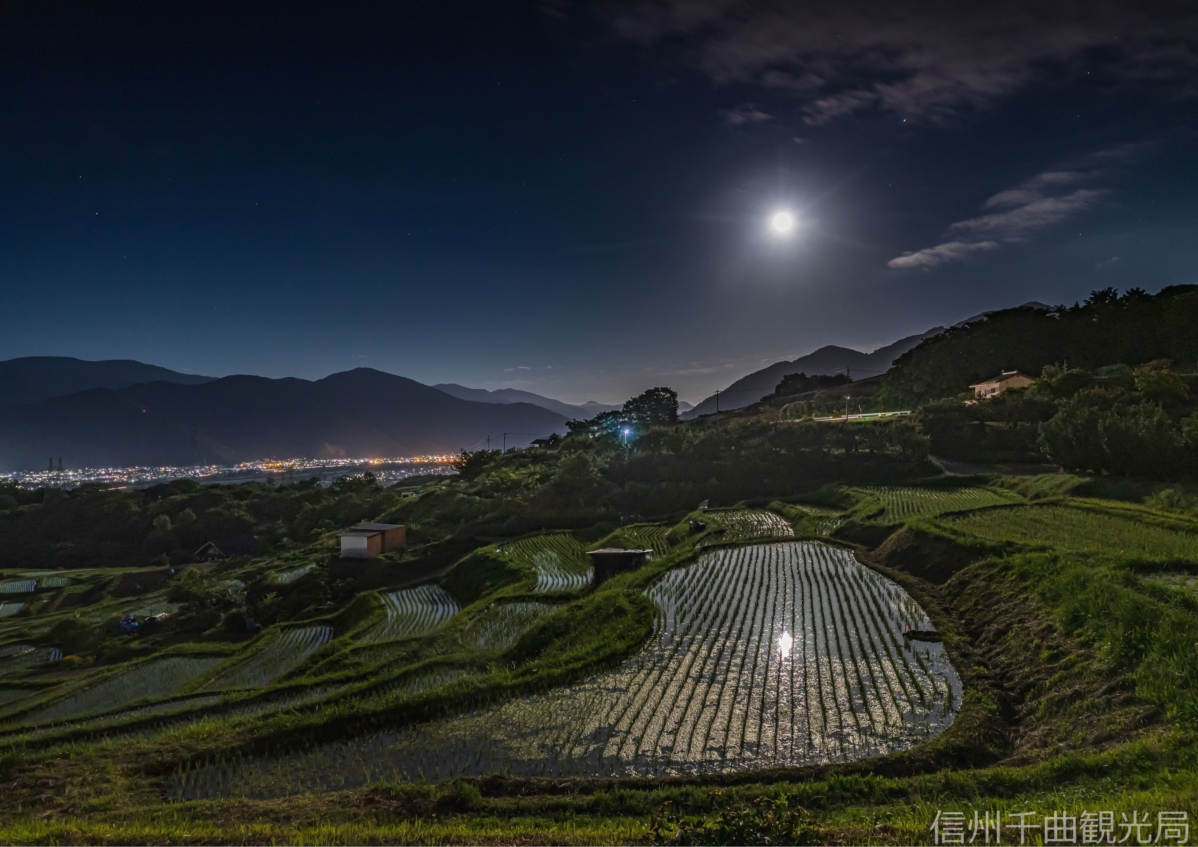 棚田として全国で初めて名勝に指定された「姨捨の棚田」や、重要伝統的建造物群に選定された「旧街道・稲荷山」は、令和2年6月に日本遺産「月の都 千曲」に認定されました。また一目十万本とうたわれる「あんずの里」や、1600年前の姿に完全復元された「森将軍塚古墳」のほか、古くから善光寺参りの精進落としの湯としても栄えてきた「戸倉上山田温泉」は開湯120年を迎え、昭和レトロな雰囲気の旅館、ホテルや様々な飲食店が立ち並び、情緒豊かな信州屈指の温泉街を形成しています。