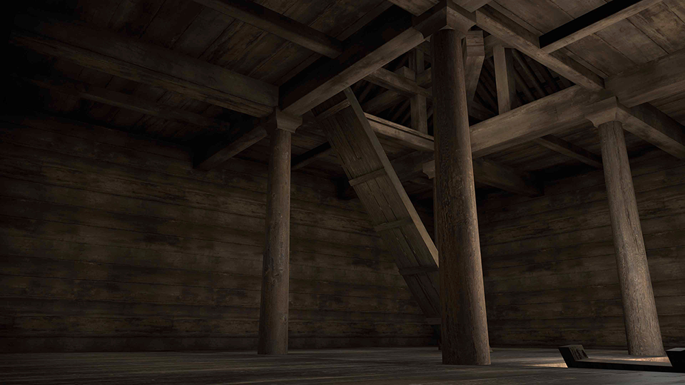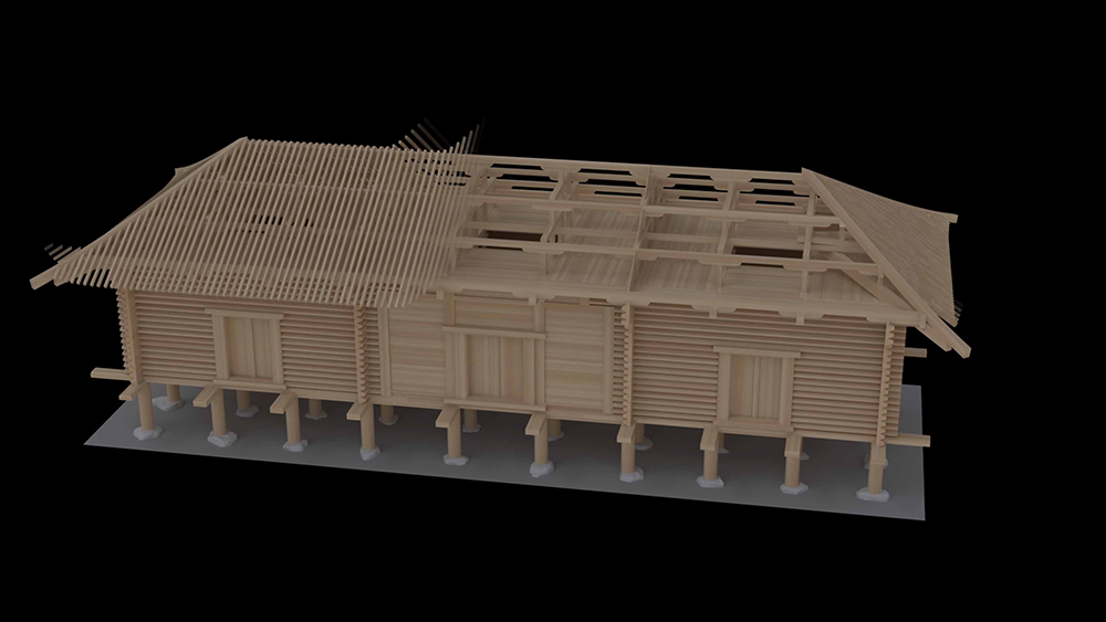 本作品で再現された「正倉」では、通常の視点では見ることのできない部分まで鑑賞することができ1260余年を経た校倉造りの木肌や鎌倉時代の落雷の焼け焦げの跡などを紹介しながら、内部空間を自由に移動し解説します。また、校倉造りの建築工法もCG映像で紹介。スクリーン上に再現された「正倉」を鑑賞しながら、いかに壮大な建築であったかを体感できます。