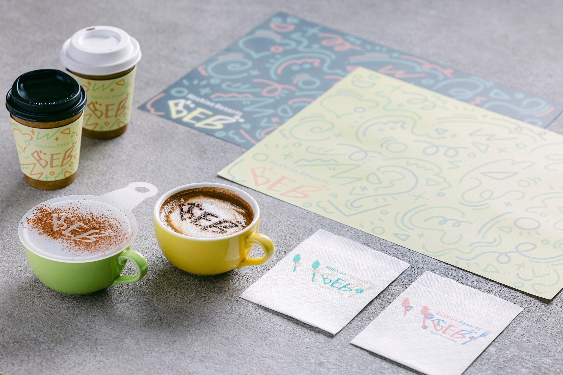 ※ステンシルでスープやラテ、お皿など、さまざまなところにBEBのロゴを描くことが可能。