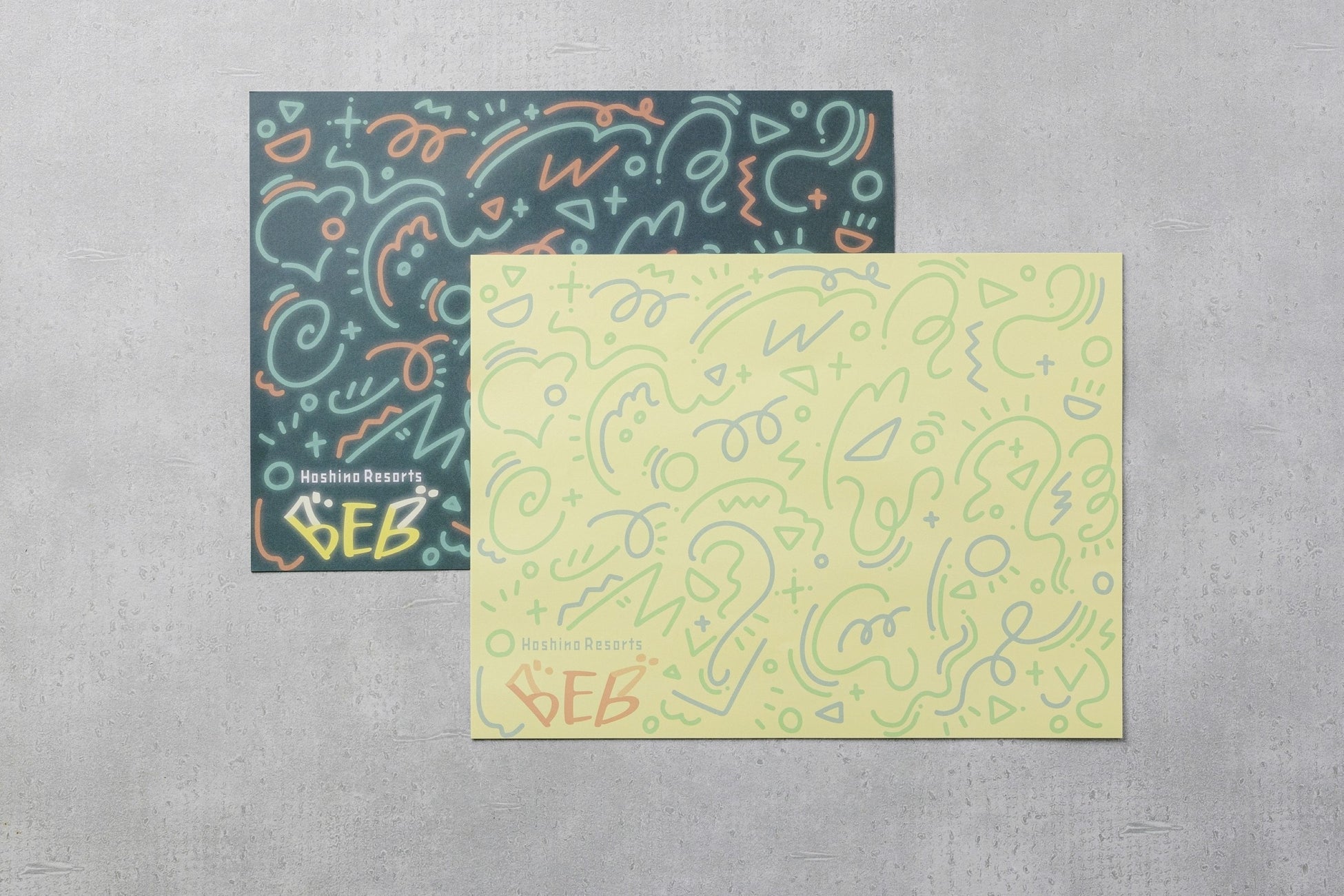 軽井沢のナチュラルな雰囲気とBEBのポップなロゴを調和させるために、トレーペーパーをアクティブなデザインにしました。BEB5軽井沢に宿泊した際、夜にTAMARIBAで作業をしていましたが、カフェを利用する方も見られたので、夜用のトレーペーパーも作成しました。夜は照明が暗めなので、ネオンなデザインにしました。デザインペーパーになっているので、食べ終わった後も利用できます。