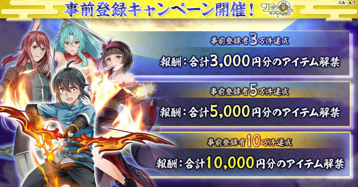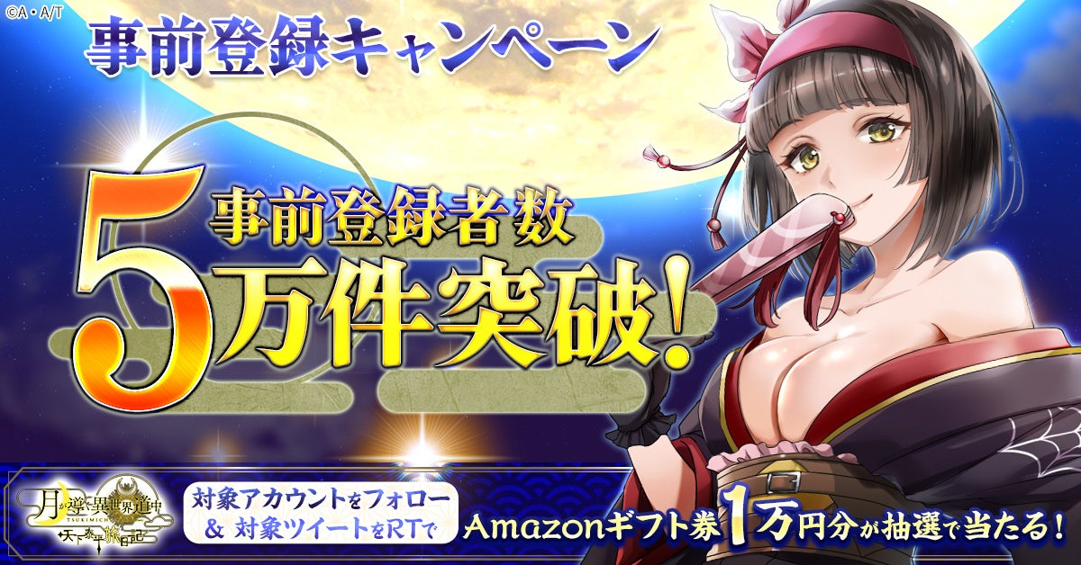 「月が導く異世界道中 天下泰平旅日記」は、事前登録5万件を達成しました。事前登録5万件達成に伴い、合計5,000円分のキャンペーン報酬を解禁!リリース時のキャンペーンをお楽しみに!