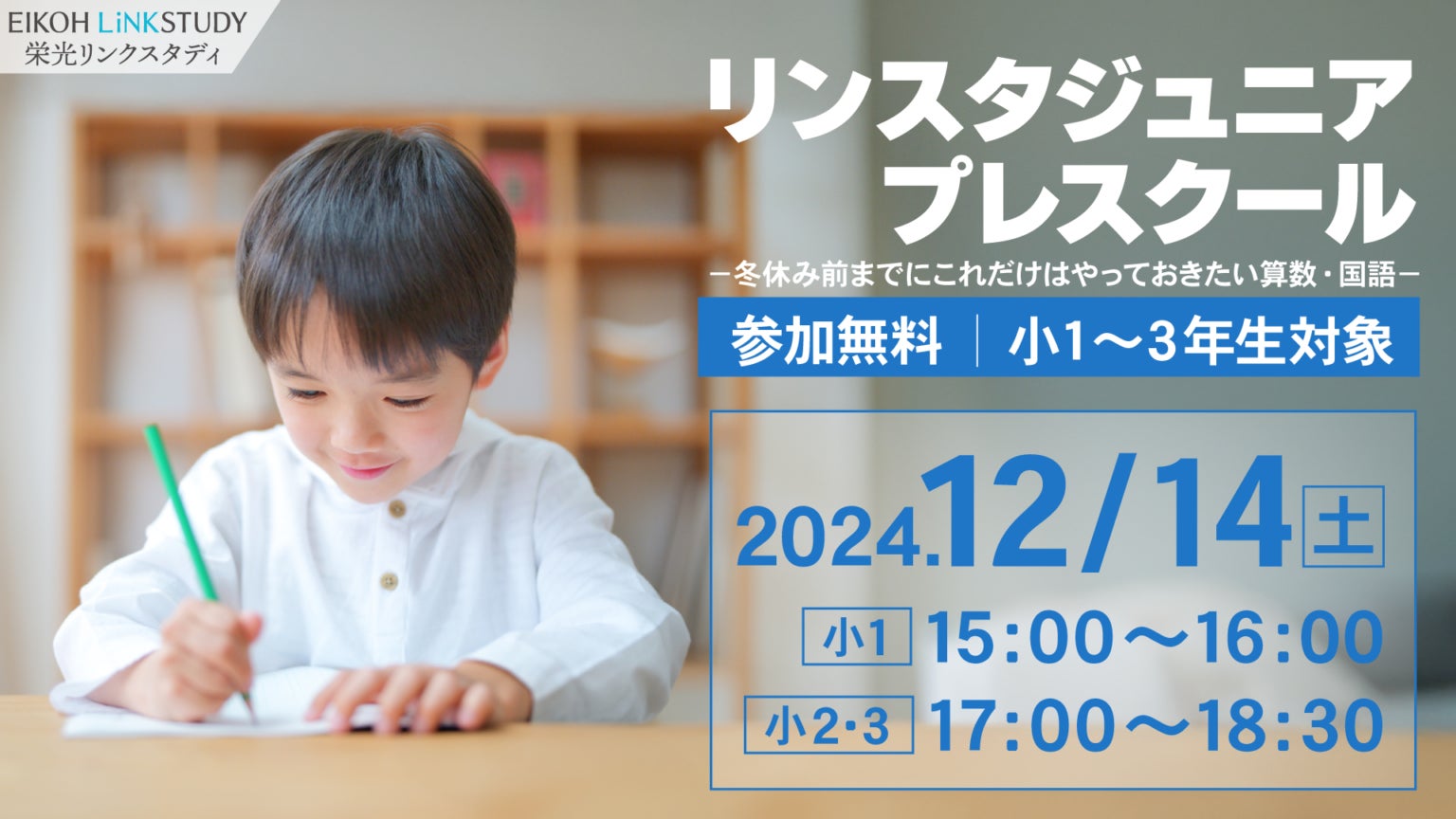 株式会社増進会ホールディングス(Z会グループ)のグループ会社、株式会社栄光(本社:東京都千代田区 代表取締役社長:下田勝昭)が運営するオンライン進学塾「EIKOH LiNKSTUDY(栄光リンクスタディ)」は、小学1・2・3年生を対象に「リンスタジュニアプレスクール」を2024年12月14日(土)に開催します。学校よりも先どりのカリキュラムで、オンライン授業や家庭学習の進め方、宿題の提出の仕方、先生とのオンラインでのやり取りなど、オンライン進学塾を体験することができます。冬期講習を検討している方もぜひご参加ください。