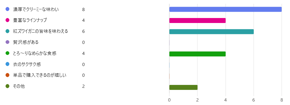 最も多くの票を集めたのは『濃厚でクリーミーな味わい』というポイントでした。2位は『紅ズワイガニの旨味を味わえる』、同率3位は『豊富なラインナップ』、『とろ~りなめらかな食感』でした。