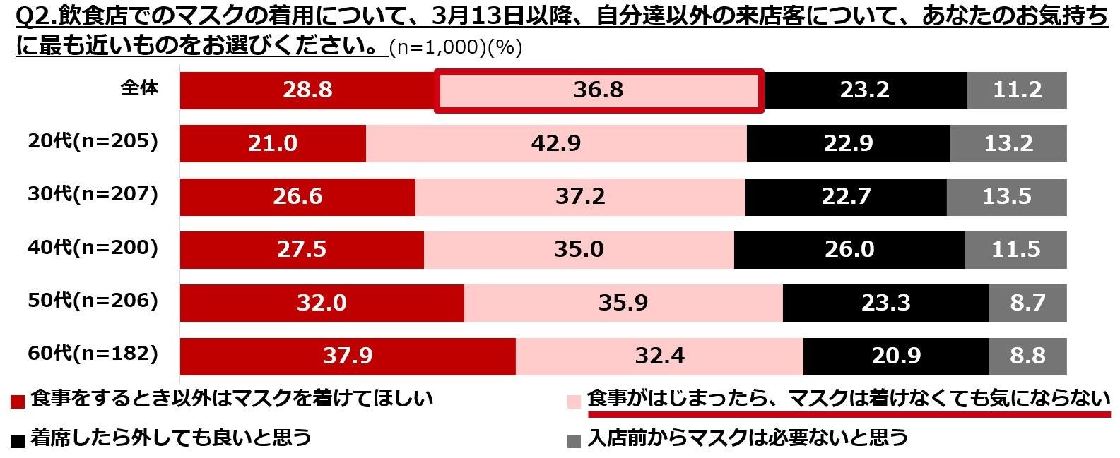 ・他の来店客については「食事をするとき以外はマスクを着けてほしい」が3割、「食事がはじまったら、マスクは着けなくても気にならない」が4割。年代が上がるほどマスク着用を望む傾向が高め。