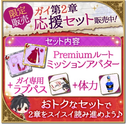 ガイ本編ストーリー第2章のミッションアバターとガイ専用ラブパス、体力が入ったお得なセットを販売しております。