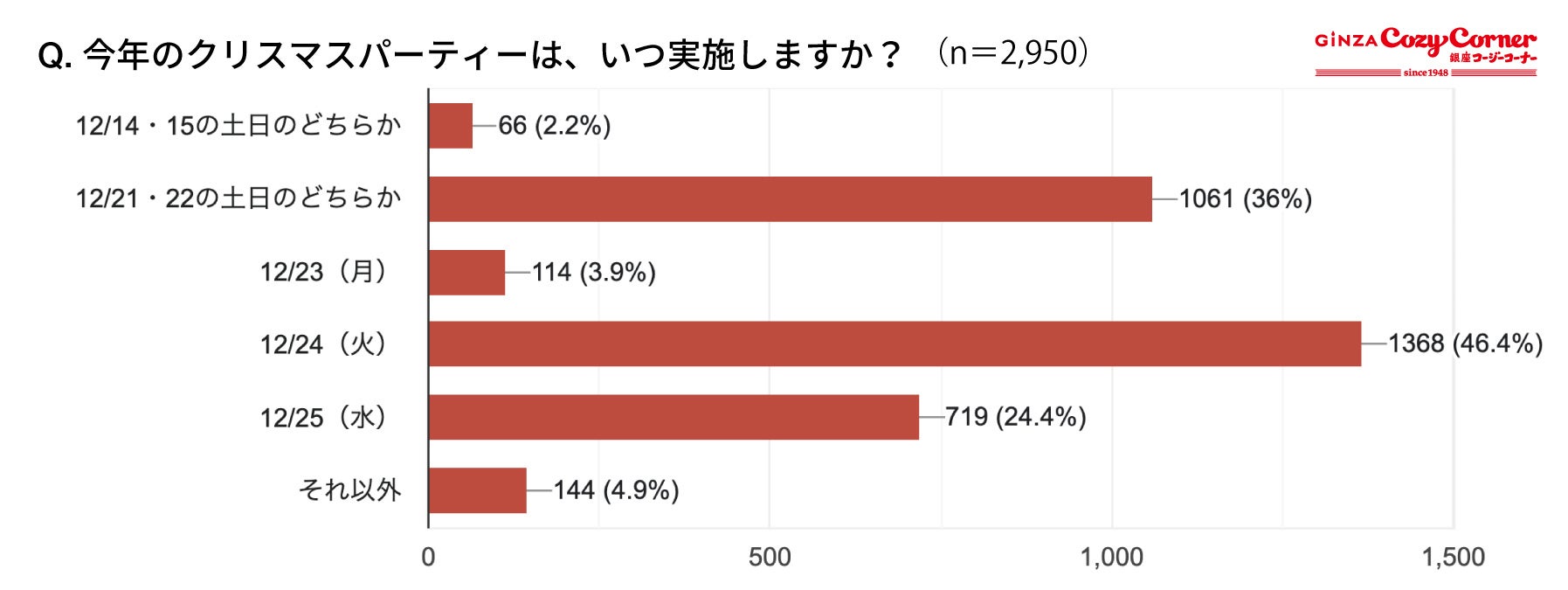 【銀座コージーコーナー】今年の平日クリスマス、パーティーはいつやる? 2,950人に大調査!第1位は「24日」。気になる第2位は?