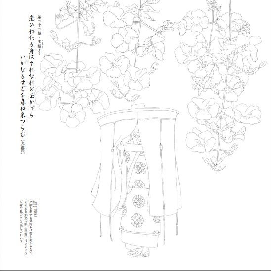 ◆工夫その2)ぬりえに添えられた和歌や源氏物語の本文の抜粋(現代語訳つき)
