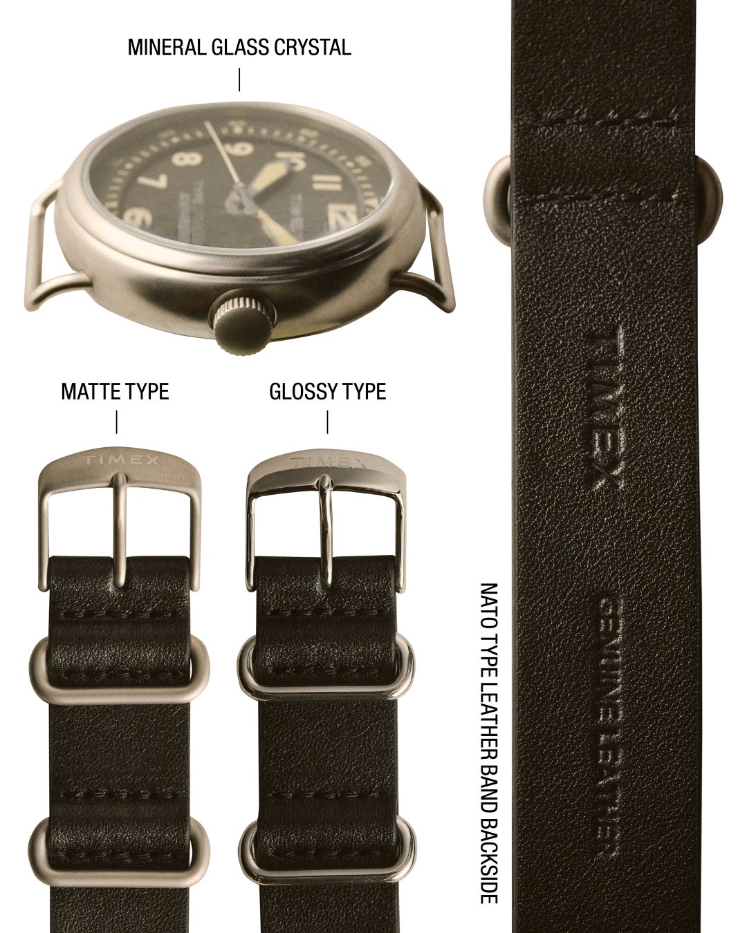米軍機のコックピット計器をモチーフにした文字盤&針を採用し、「TIMEX」独自の“INDIGLO®ナイトライト”機能で夜間も視認性抜群。ケースは丸みを帯びた38mmステンレススチール製で、裏蓋には両ブランドのロゴを刻印。