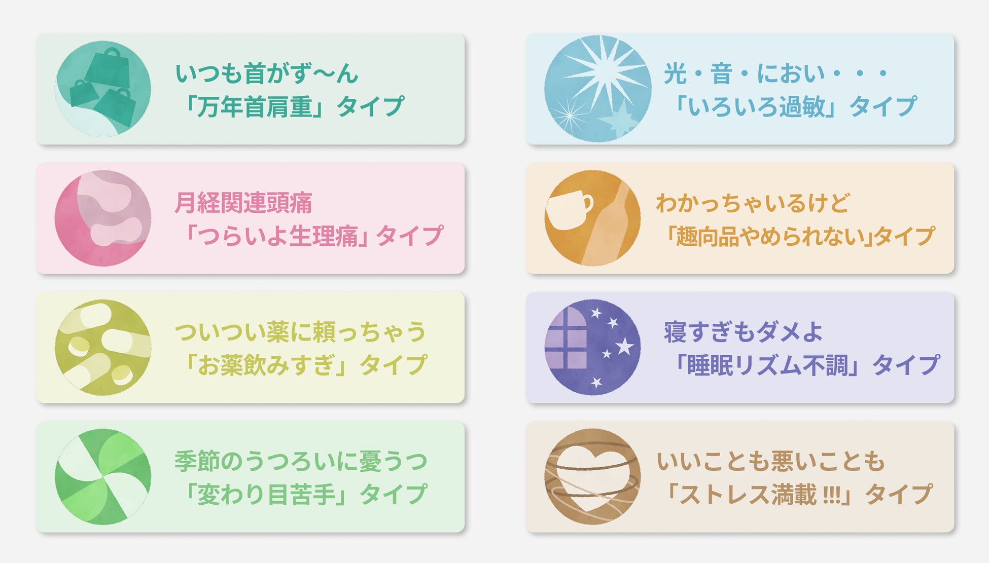 頭痛に関する18問のアンケートに回答することで、頭痛の誘因タイプを判定します。肩や首のこりが頭痛に起因するタイプや、光や音の過敏など生活環境に影響を受けやすいタイプ、季節の変わり目に影響を受けやすいタイプなど、8つの頭痛タイプの中から誘因を認識することができます。これにより、自身の頭痛誘因タイプに適したケアプログラムを選択することができます。