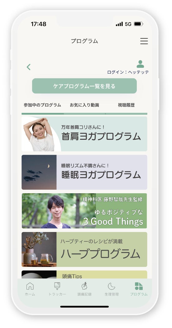 首肩ヨガプログラムやメンタルサポートプログラム、各誘因タイプ向けのハーブティーレシピを紹介するハーブプログラムなど、自身の頭痛誘因タイプに合わせたケアプログラムを選択できます。