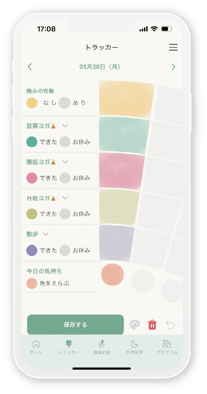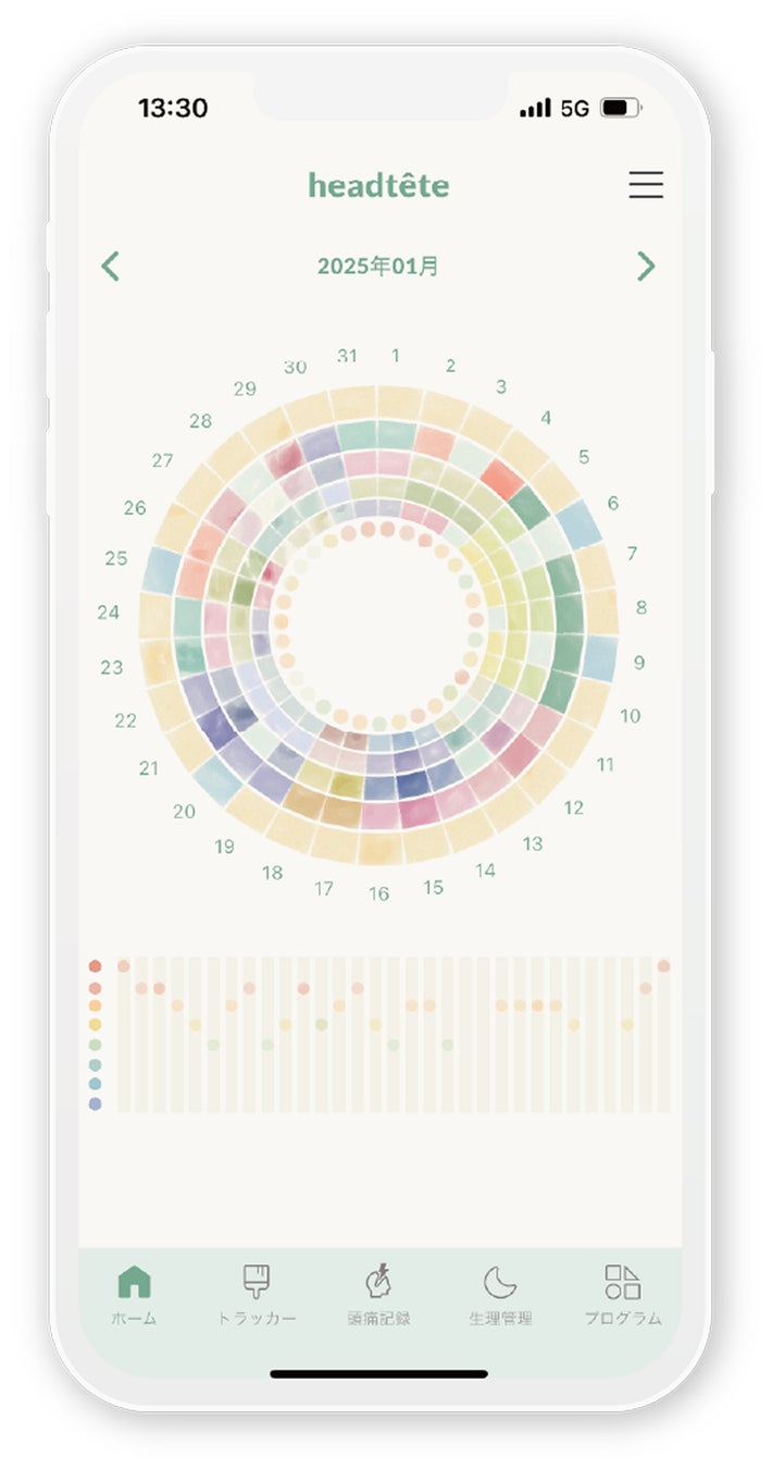 毎日楽しく継続し記録するモチベーションを維持できるよう、視覚的な満足感に寄り添ったデザインを実現しています。ハビットトラッカーに記録を重ねることで、頭痛のない日の過ごし方も意識しながら日々の生活習慣改善をサポートします。