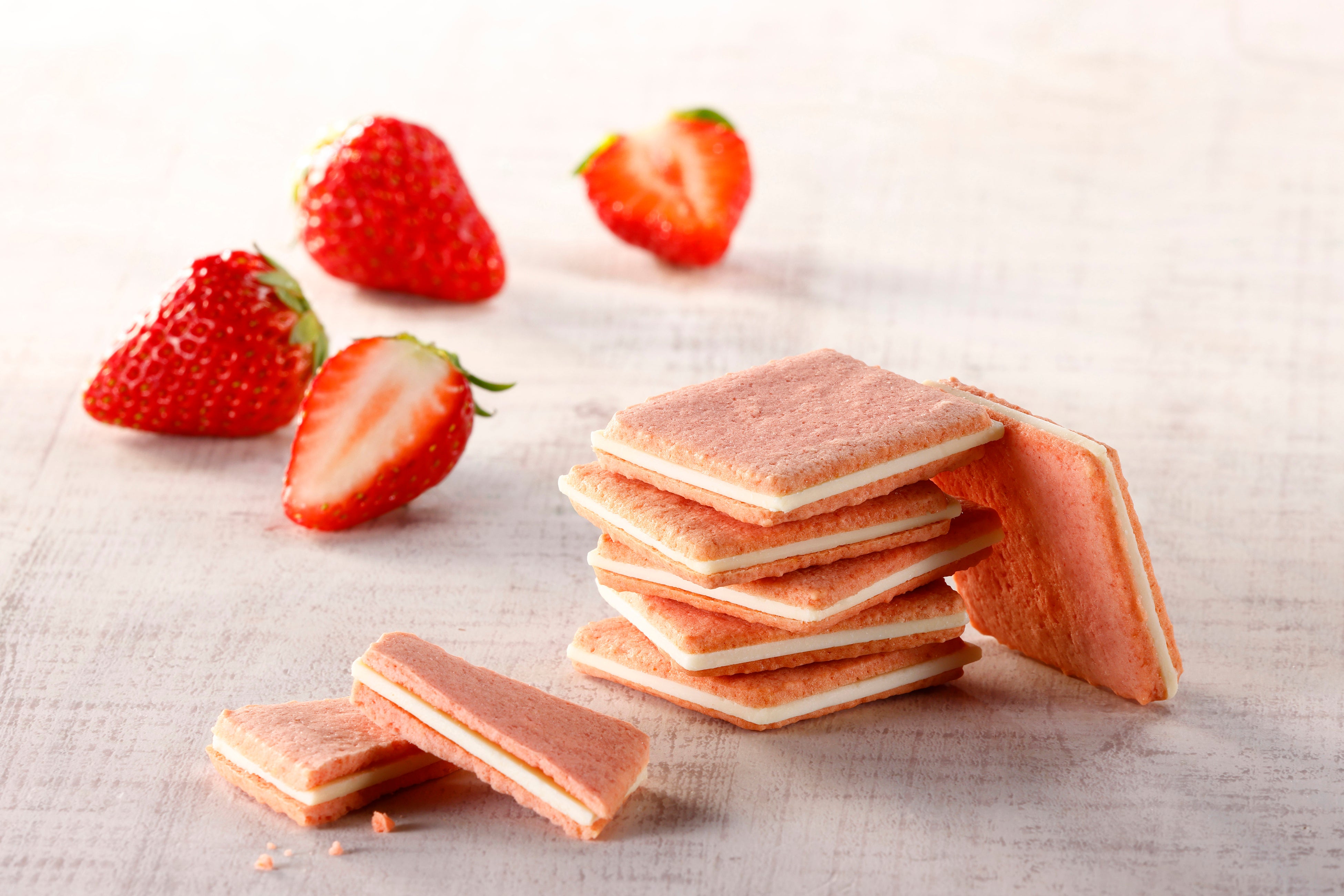 春らしい華やかなピンク色のフルーティーなストロベリークッキーでミルク感のあるやさしい甘さのマスカルポーネチーズ風味のチョコ(※)をサンドした、サクサク食感のクッキーです。ストロベリーとマスカルポーネチーズの絶妙なマリアージュをお楽しみいただけます。