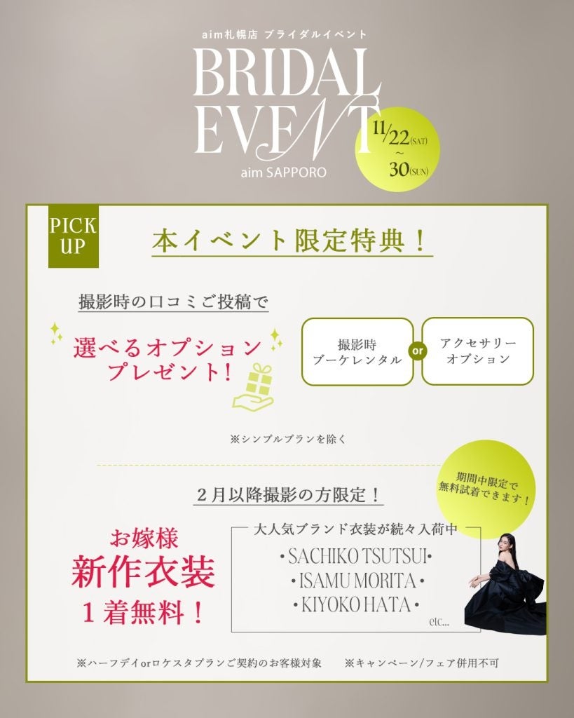 北海道札幌市のウエディングフォトスタジオ「aim札幌店」にて、ブライダルイベントの開催が決定いたしました。