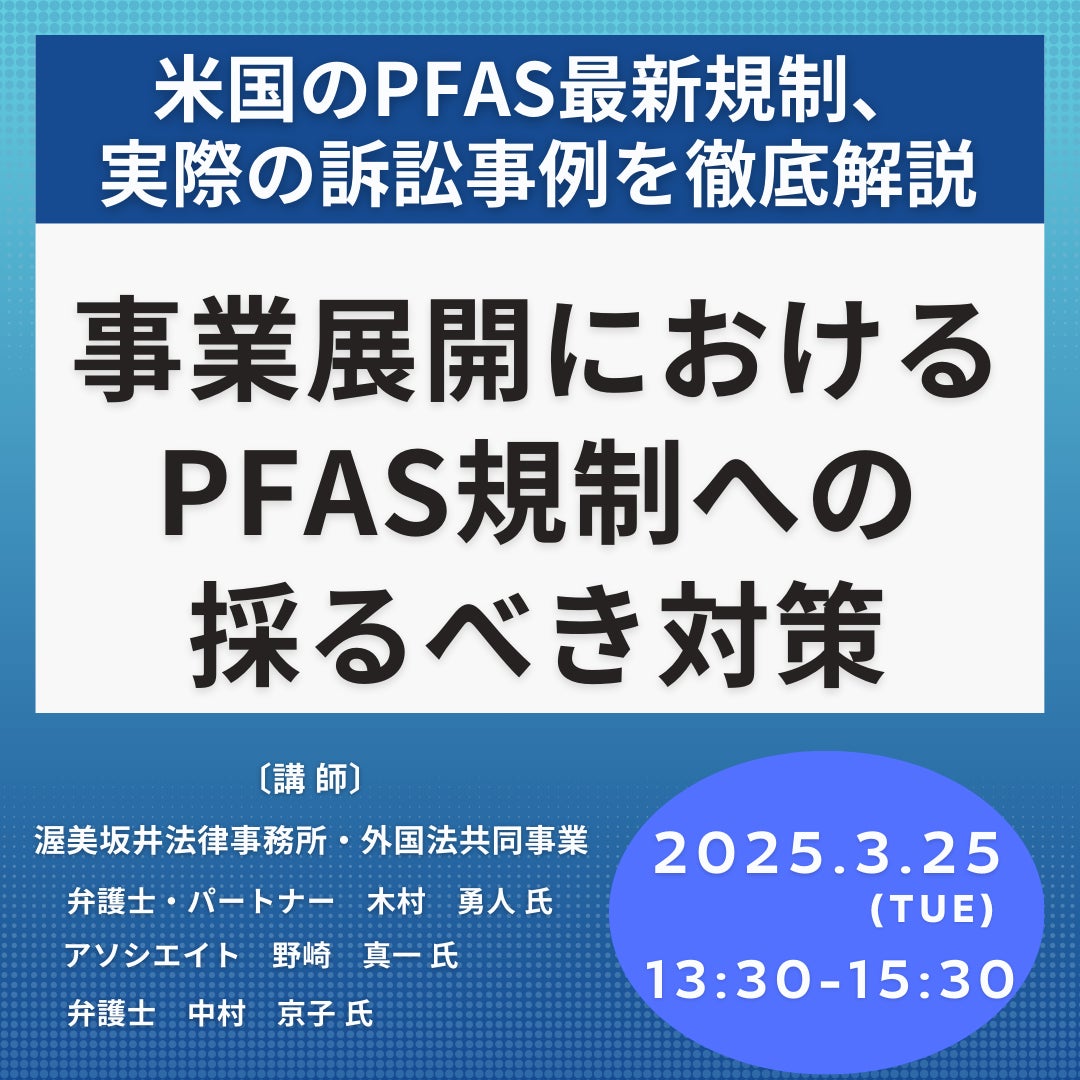 JPI(日本計画研究所)は、渥美坂井法律事務所・外国法共同事業 弁護士・パートナー 木村 勇人 氏、アソシエイト 野崎 真一 氏、弁護士 中村 京子 氏を招聘し、米国におけるPFAS最新規制、実際の訴訟事例を踏まえた事業展開におけるPFAS規制への採るべき対策について詳説いただくセミナーを開催します。