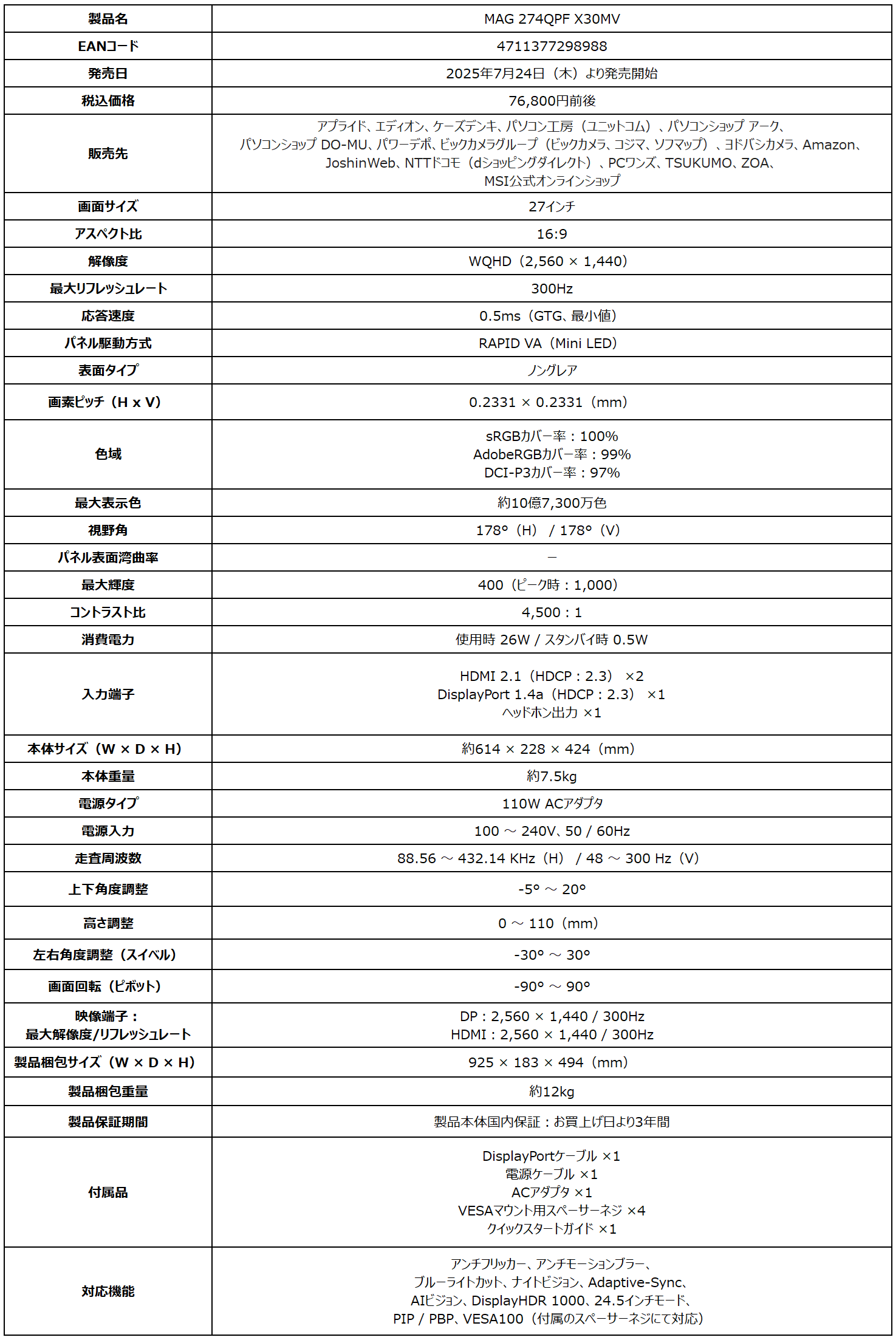 この度、エムエスアイコンピュータージャパン株式会社は2025年7月24日(木)より、ゲーミングモニターの新モデルを発売いたします。高いゲーミング性能とコストパフォーマンスに優れた『MAG』シリーズから、Mini LEDと量子ドット技術を搭載し、WQHD解像度、リフレッシュレート300Hz、応答速度0.5ms(GTG、最小値)の高いゲーミングスペックで、メリハリのある高精細で滑らかな映像を実現した「MAG 274QPF X30MV」が新たにラインナップに加わります。
