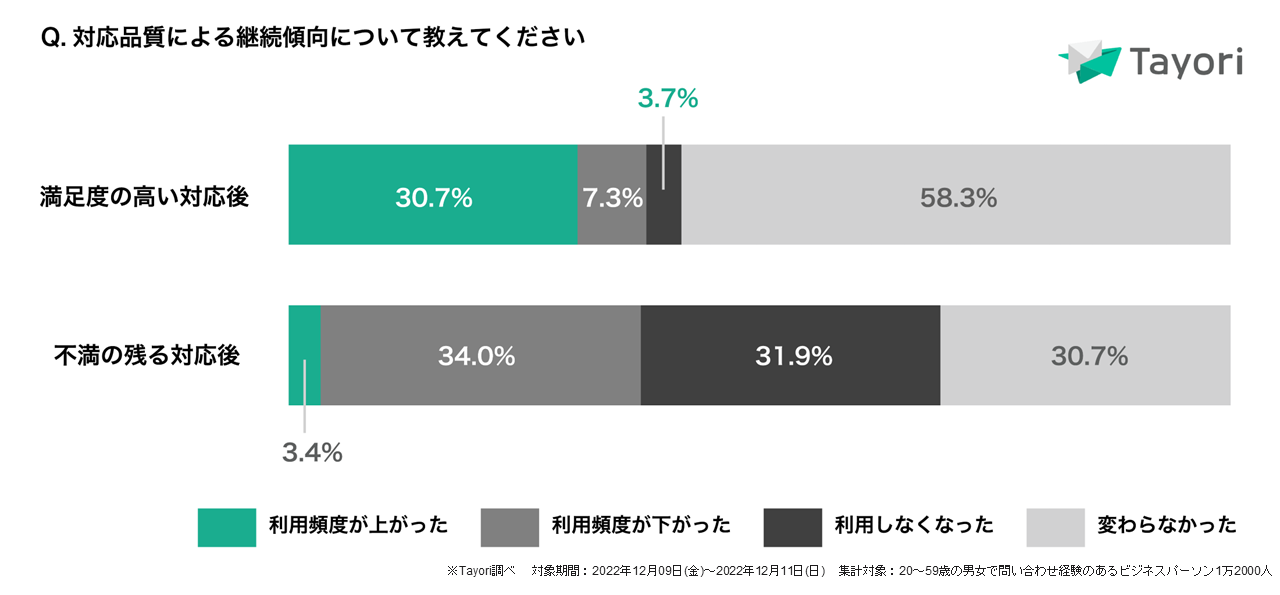 その結果、問い合わせ後の返信の想定時間として、1時間以内で半数以上の51%が、24時間以内では82%が返信を想定していることがわかりました。また、対応の満足度による継続傾向への影響では、問い合わせの対応品質別に満足度が高い場合、サービス利用頻度が30.7%向上したことに対し、満足度が低い場合の「利用頻度が下がった」もしくは「利用しなくなった」と回答したのは65.9%となりました。