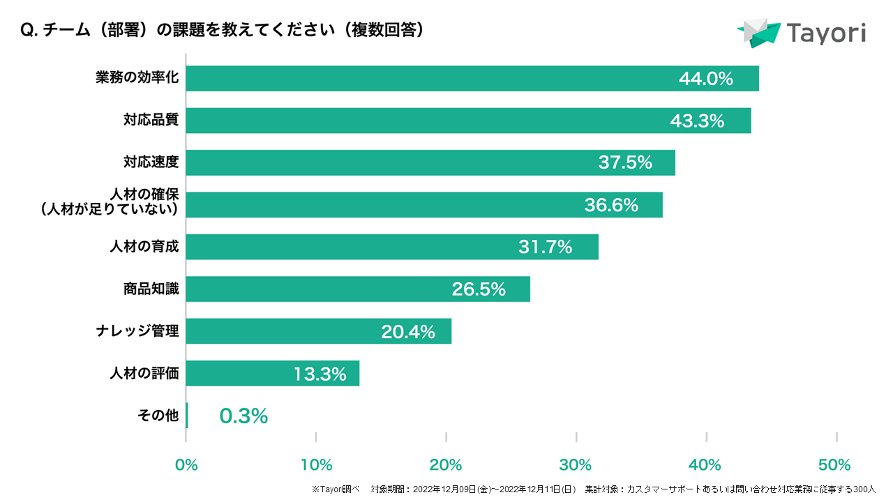 一方で、カスタマーサポート従事者が抱える課題では、「1位:業務の効率化(44%)」「2位:対応品質(43.3%)」「3位:対応速度(37.5%)」と、対応品質よりも効率化がわずかながら上回りました。